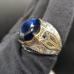 Yan kısımlarda yer alan siyah zirkon taş detayları ve yoğun kalem işçiliği, yüzüğe hem klasik hem de güçlü bir hava katmaktadır. Gövde üzerindeki desenler tamamen detaylı işçilikle hazırlanmıştır.