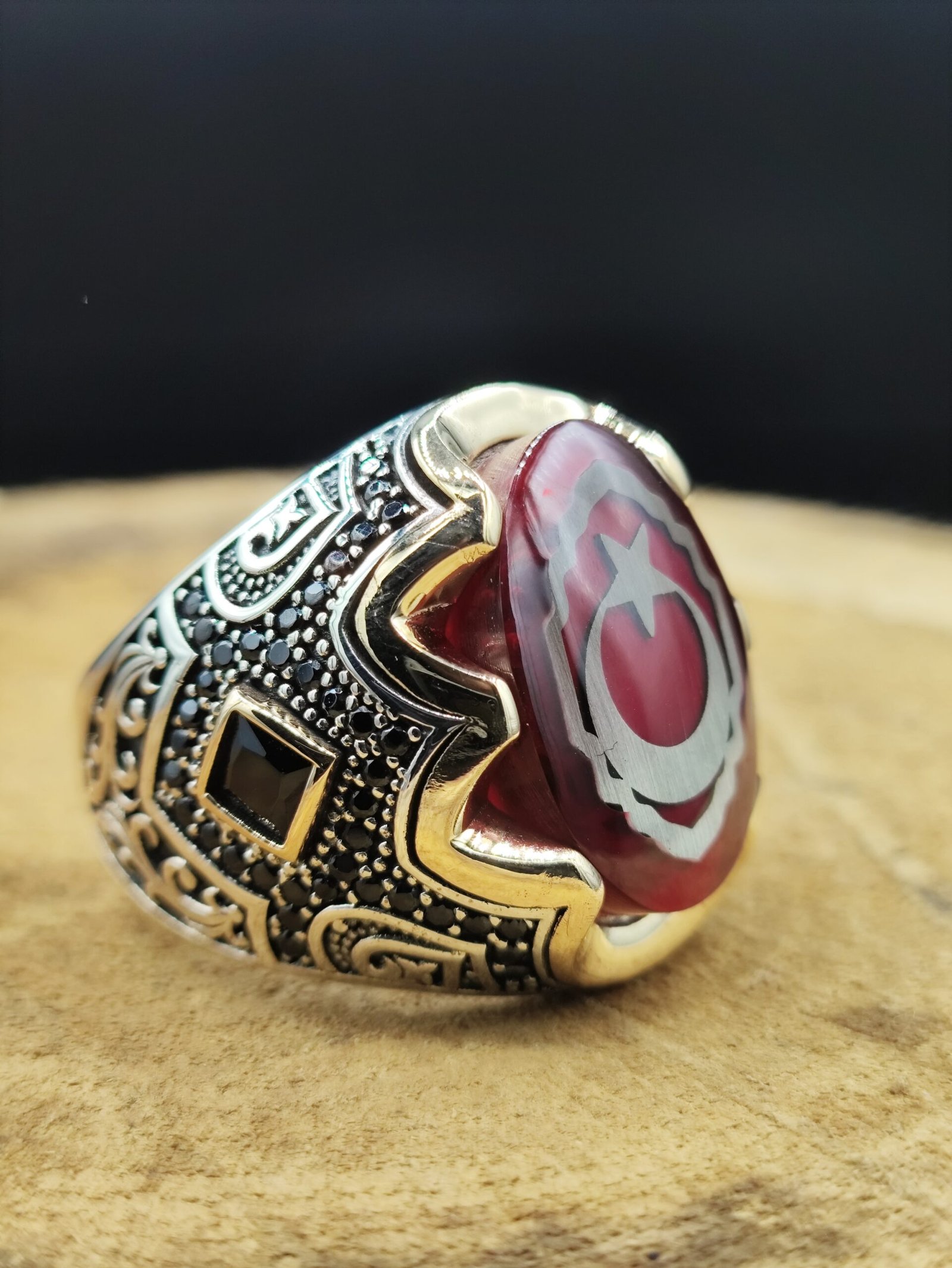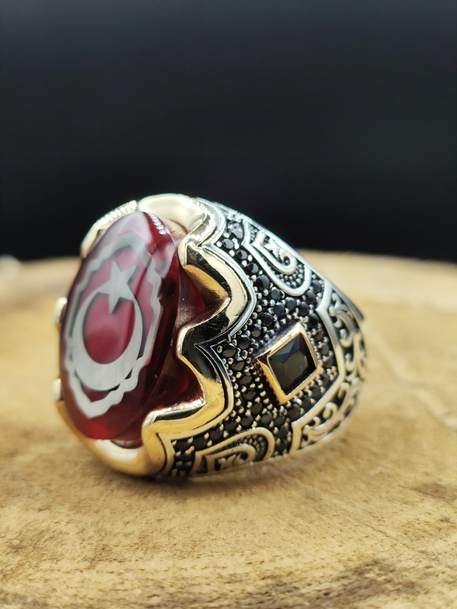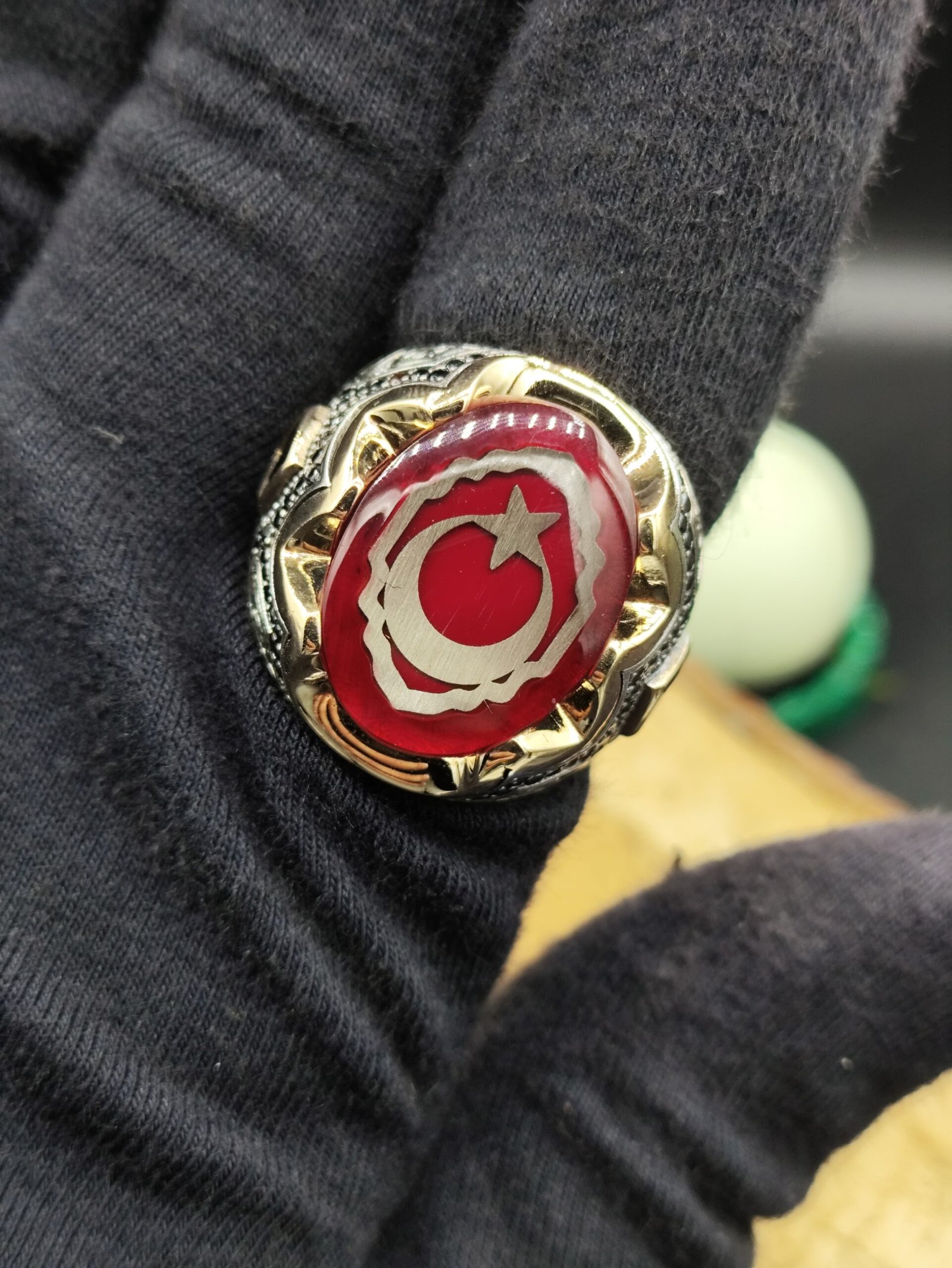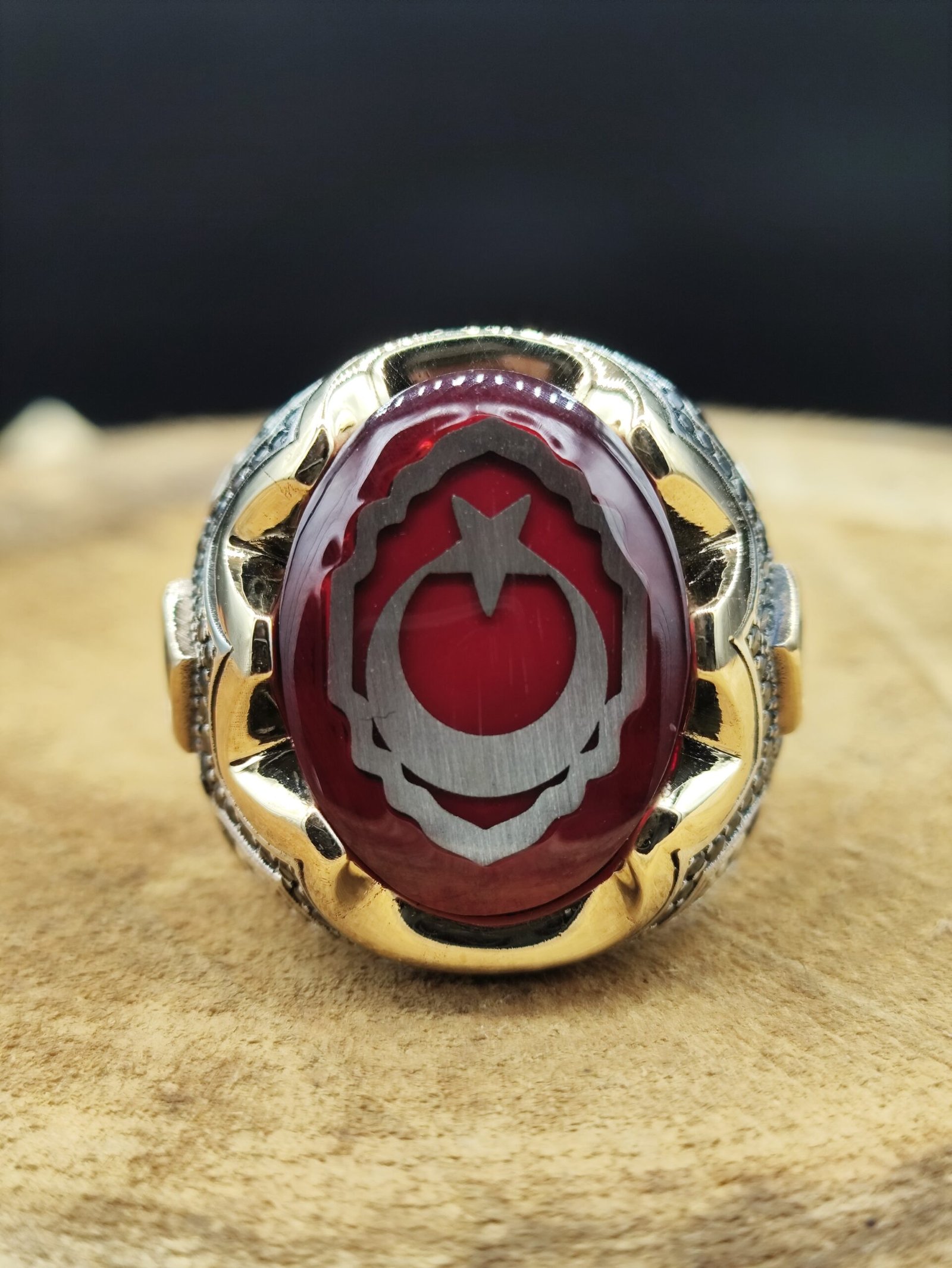 Yüzüğün merkezinde yer alan parlak kırmızı oval taş, ışıkla birlikte derin ve canlı tonlar yansıtır. Taş üzerine işlenen altın renk ay yıldız motifi, modele karakter ve anlam kazandırır. Çevresindeki altın tonlu çerçeve detayları tasarımı daha ihtişamlı hale getirir.