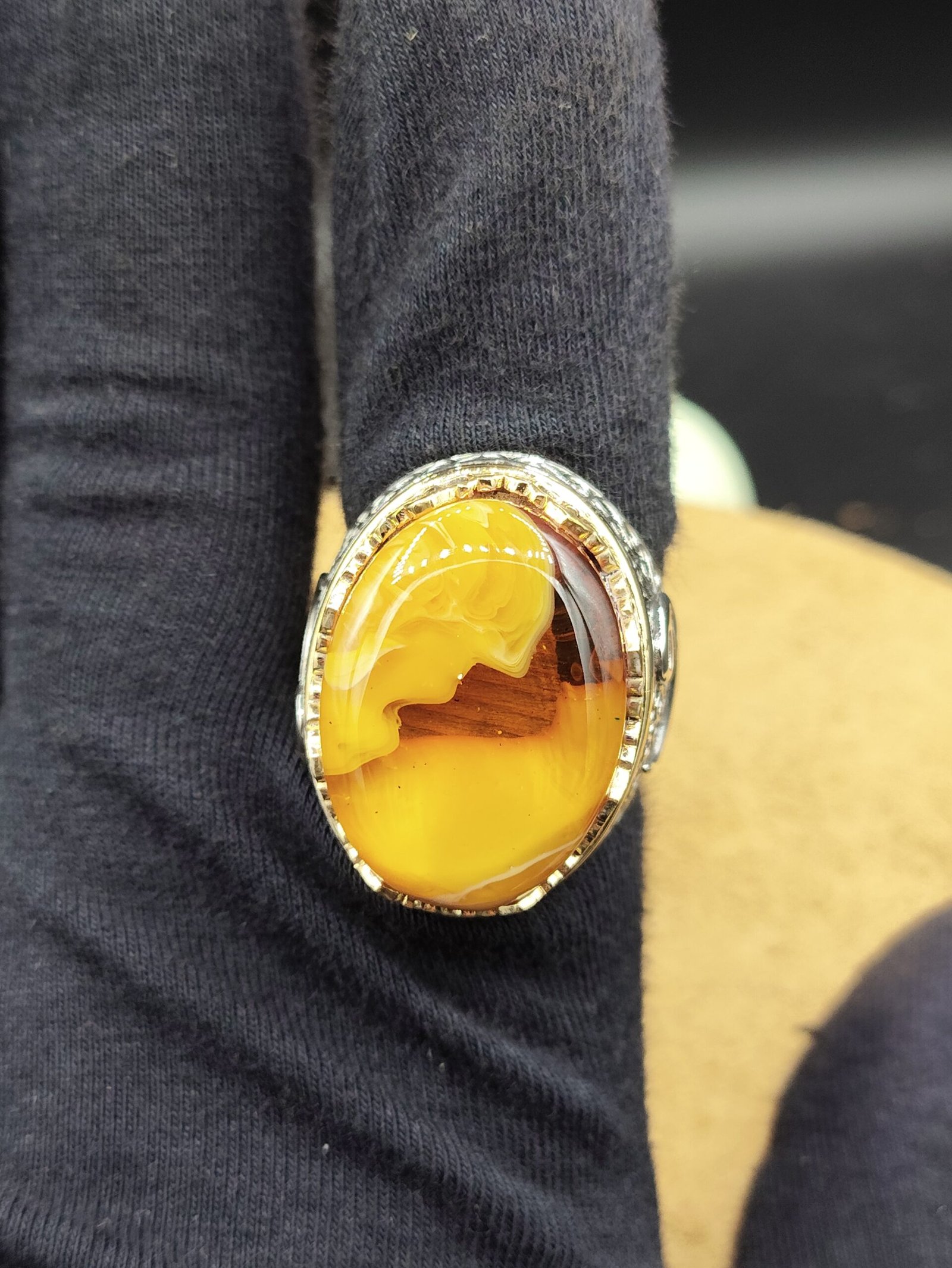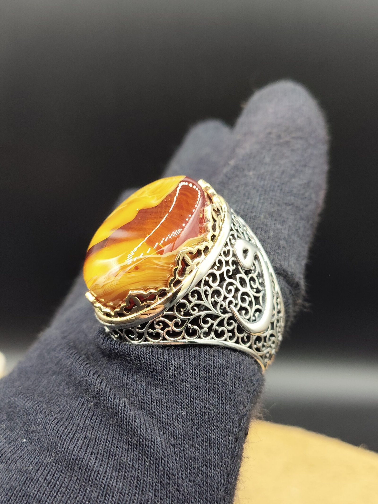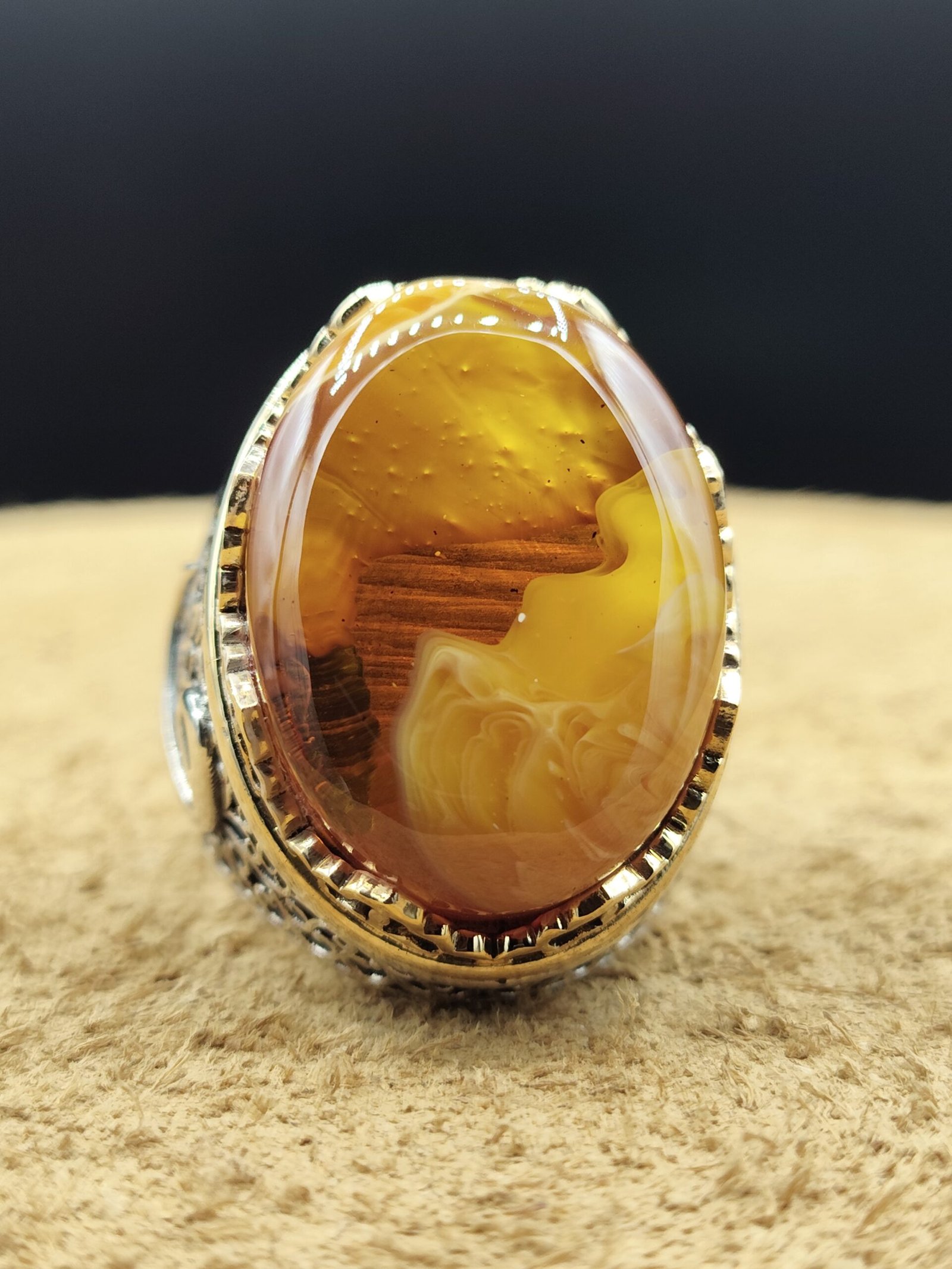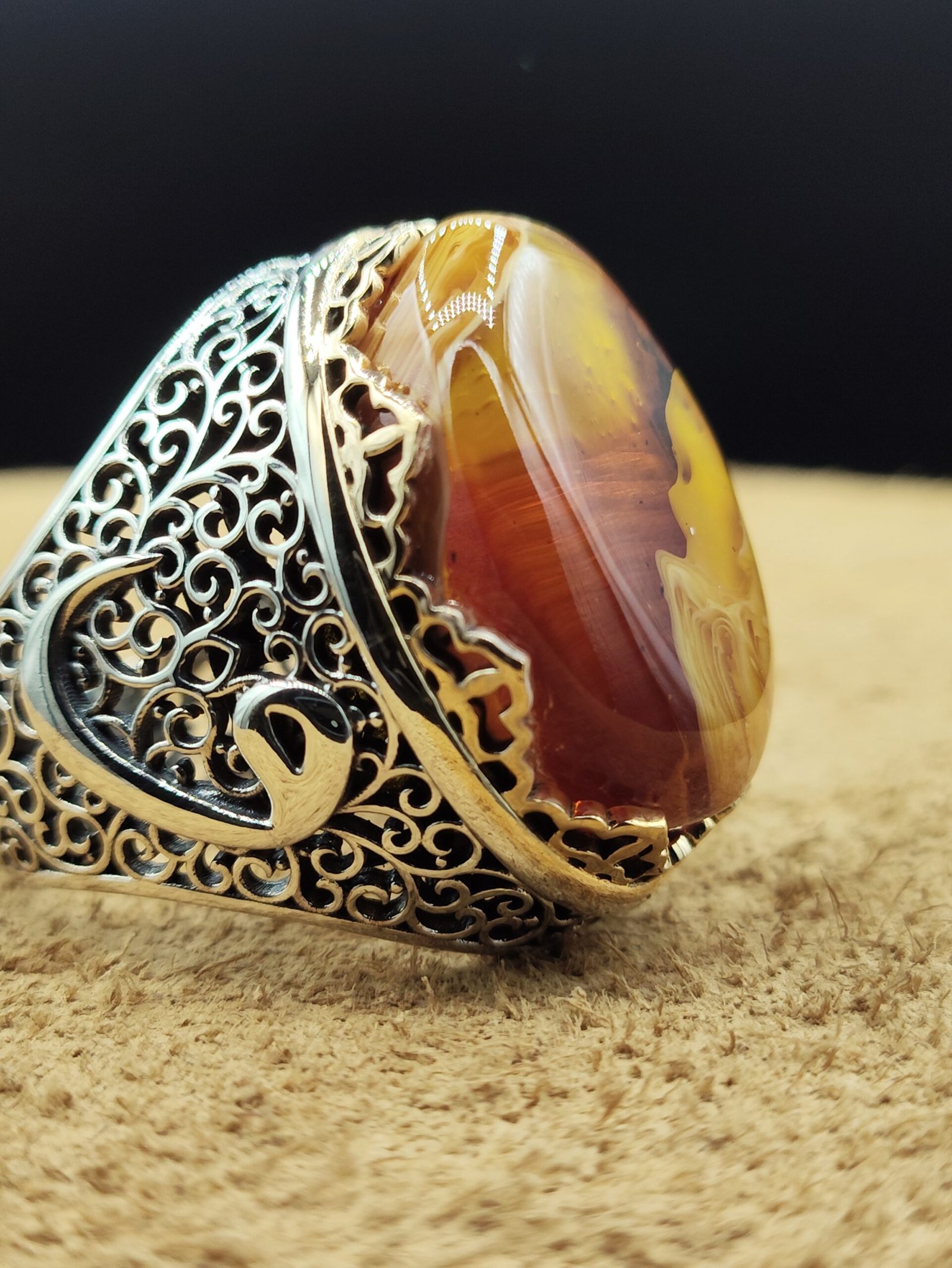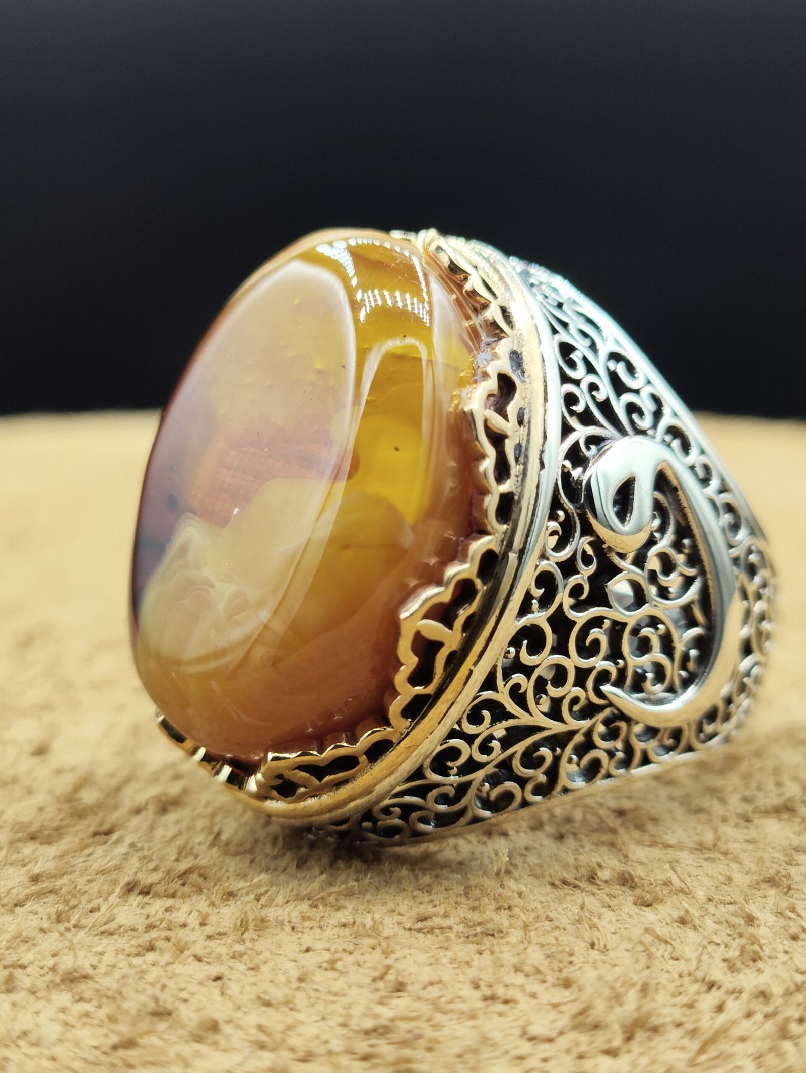 Sarı ve kahverengi ton geçişlerine sahip doğal akik taşı, kendine özgü damar yapısıyla her yüzüğü benzersiz kılar. Yan kısımlarda işlenen Vav harfi detayı tasarıma hem manevi hem estetik bir anlam kazandırır.