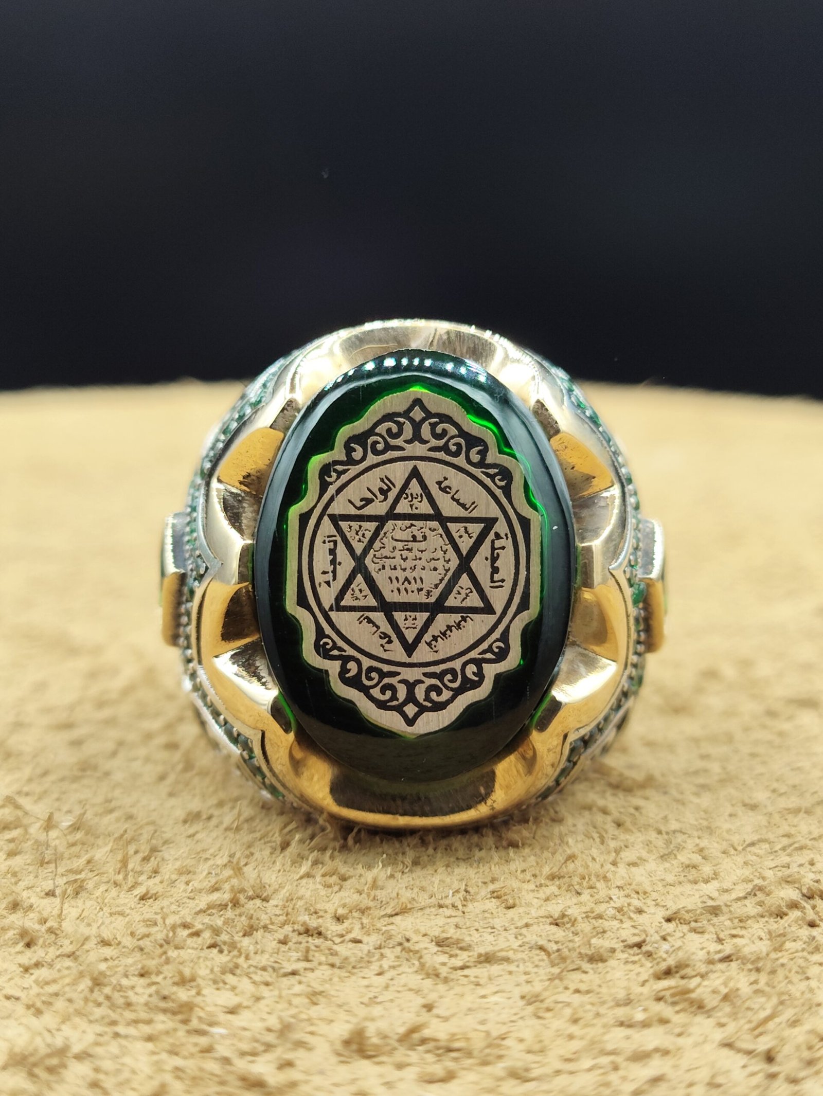 Göz alıcı koyu yeşil taş detayı ve merkezinde yer alan Süleyman Mührü motifi ile tasarlanan bu özel model, 22 gram ağırlığında 925 ayar gümüşten üretilmiştir.