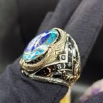 Oval formdaki parlak yeşil taş üzerine işlenen altın tonlu mühür detayı yüzüğe güçlü ve mistik bir hava kazandırır. Yan kısımlarda bulunan yeşil taş dizilimi ve kabartma motifler, modele zengin ve gösterişli bir karakter katmaktadır.