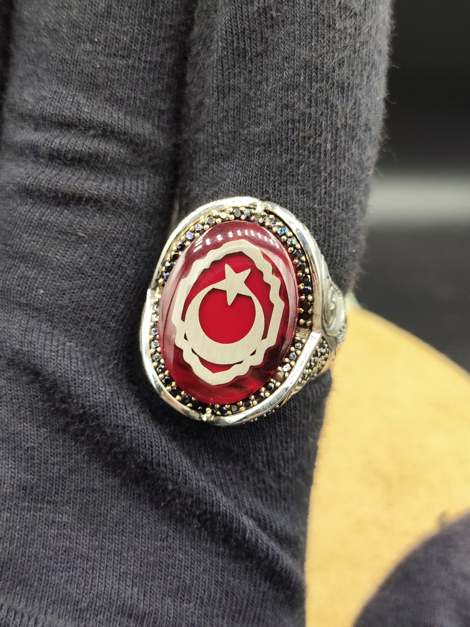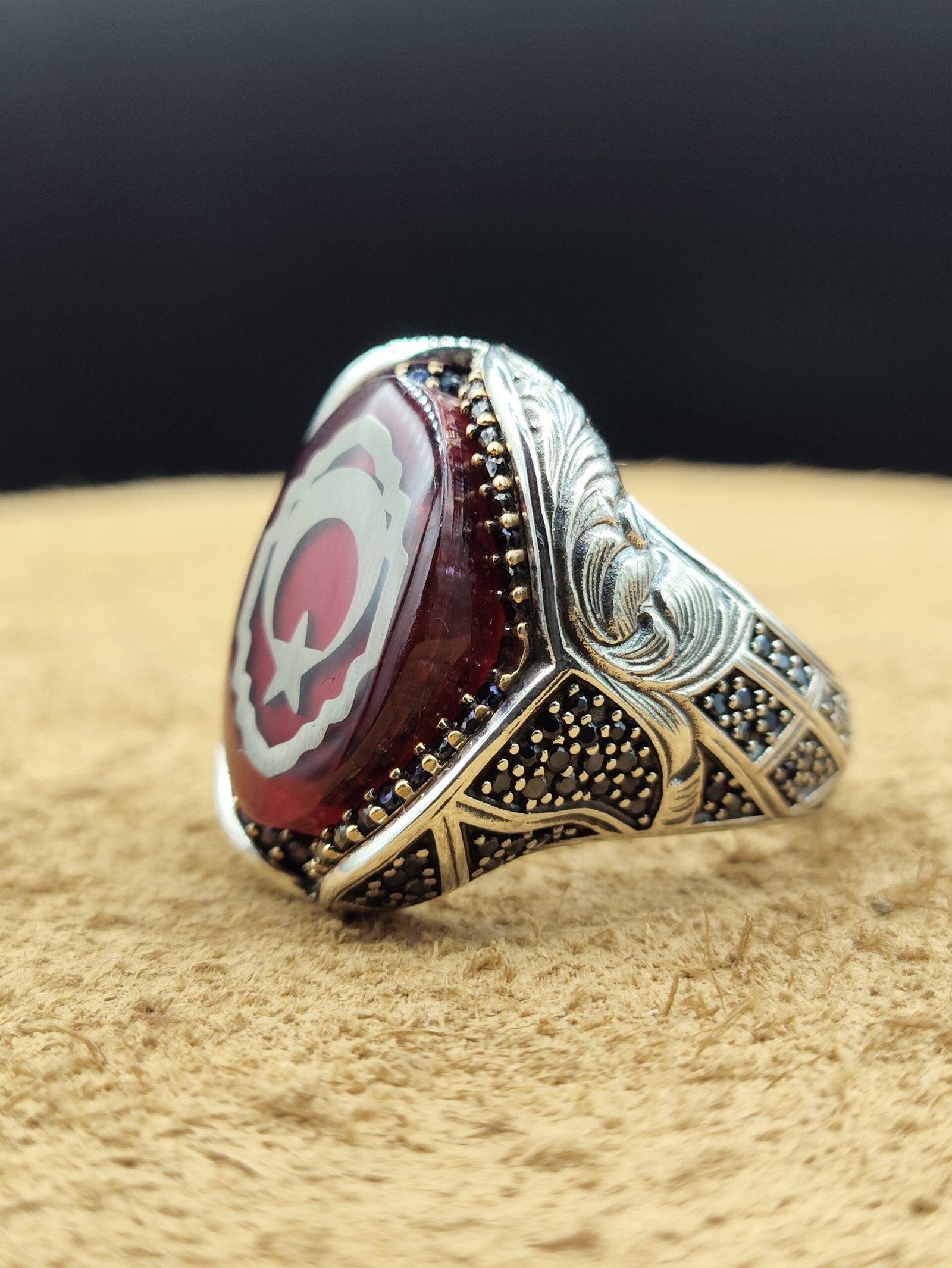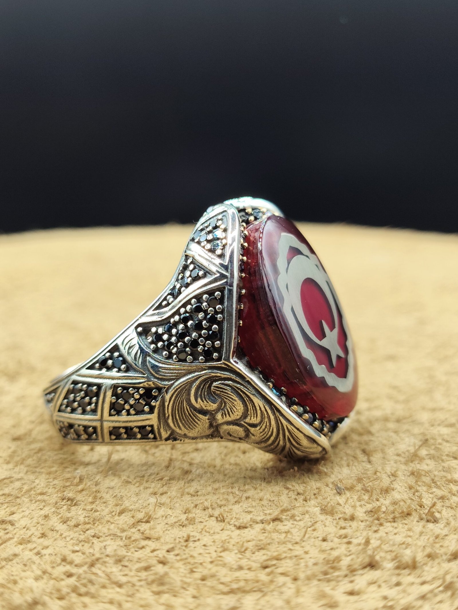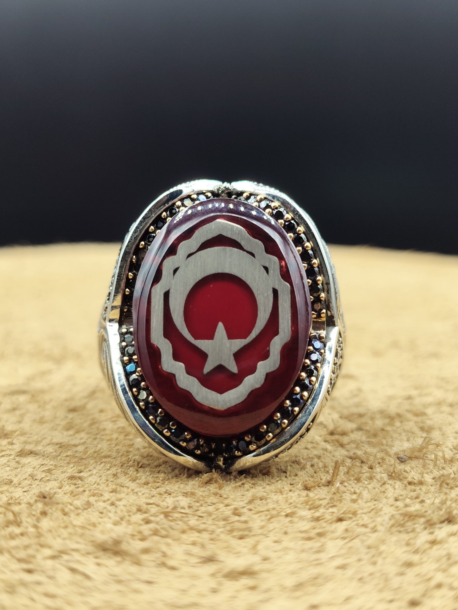 925 ayar gümüşten üretilmiş özel tasarım erkek yüzük, kırmızı mineli zemin üzerine ay yıldız detayı ile güçlü ve anlamlı bir tasarım sunar. Gösterişli yapısı ve dikkat çekici rengi sayesinde stilinizi ön plana çıkarır.