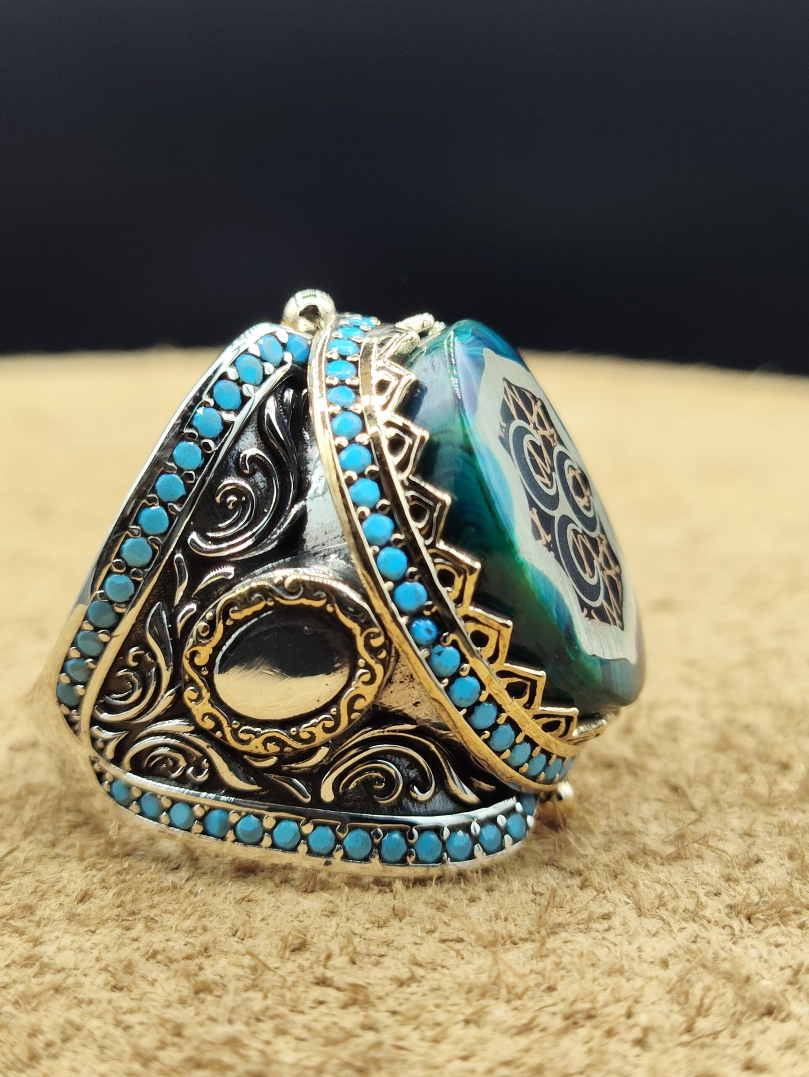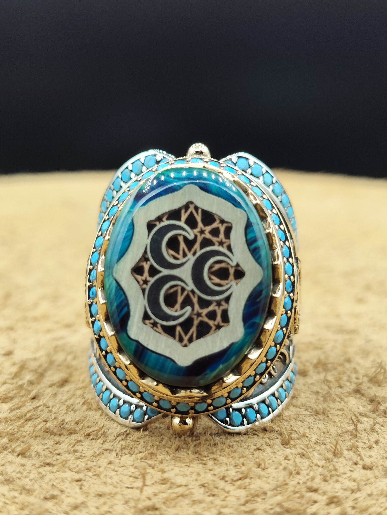 925 ayar gümüşten üretilmiş özel tasarım erkek yüzük, merkezinde yer alan Üç Hilal motifi ve turkuaz taş detayları ile dikkat çekici ve anlamlı bir tasarım sunar. Mavi-yeşil tonlardaki zemin üzerine işlenen sembol, yüzüğe güçlü ve karakterli bir duruş kazandırır.