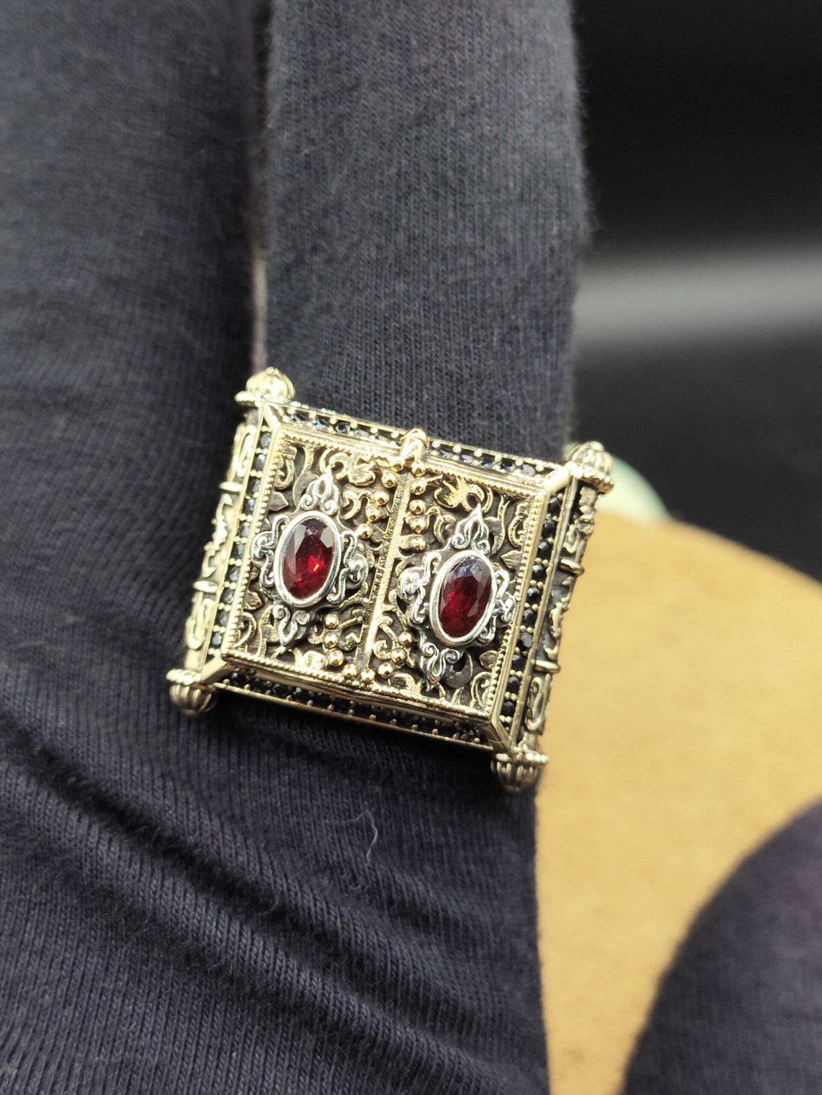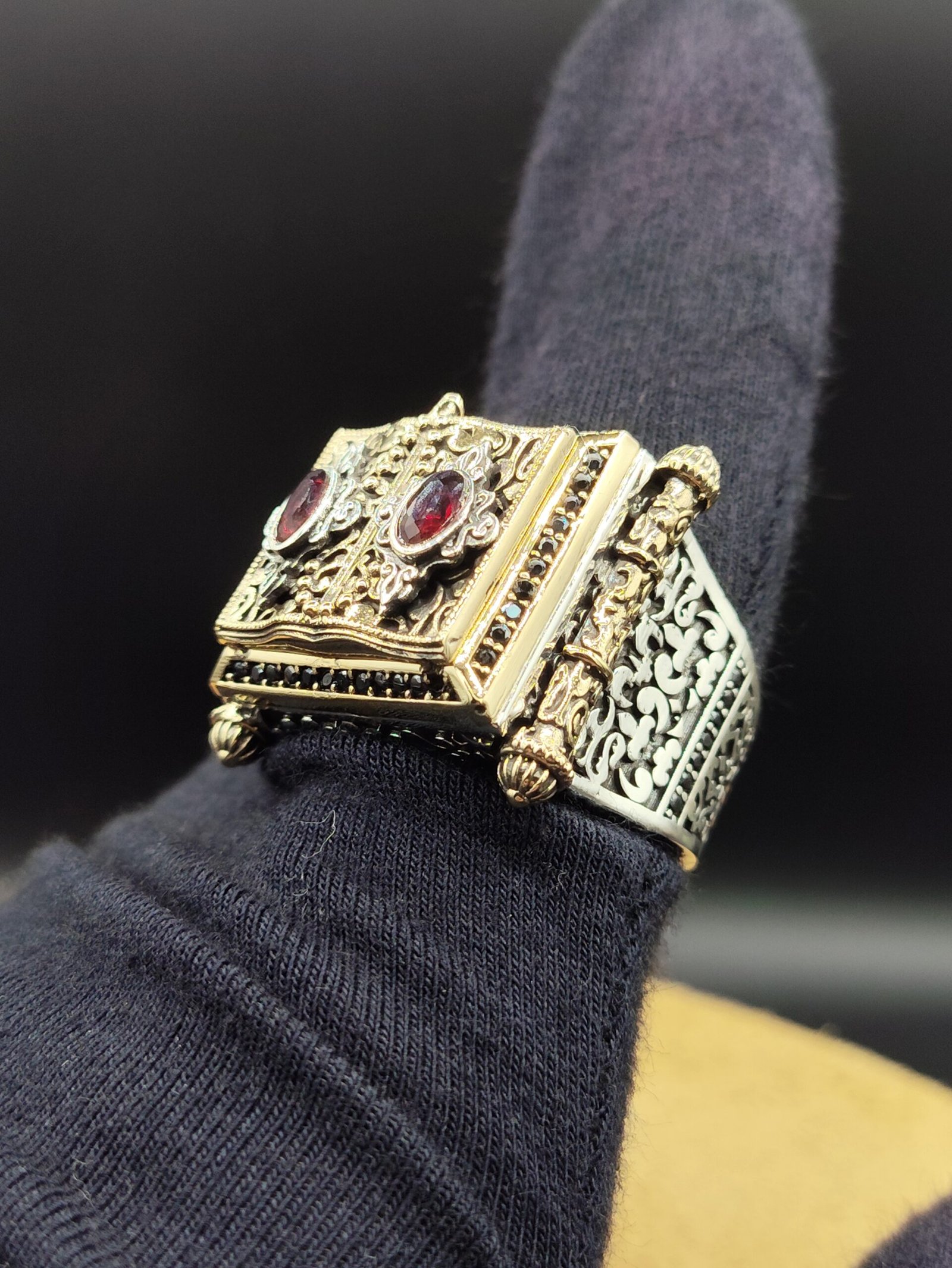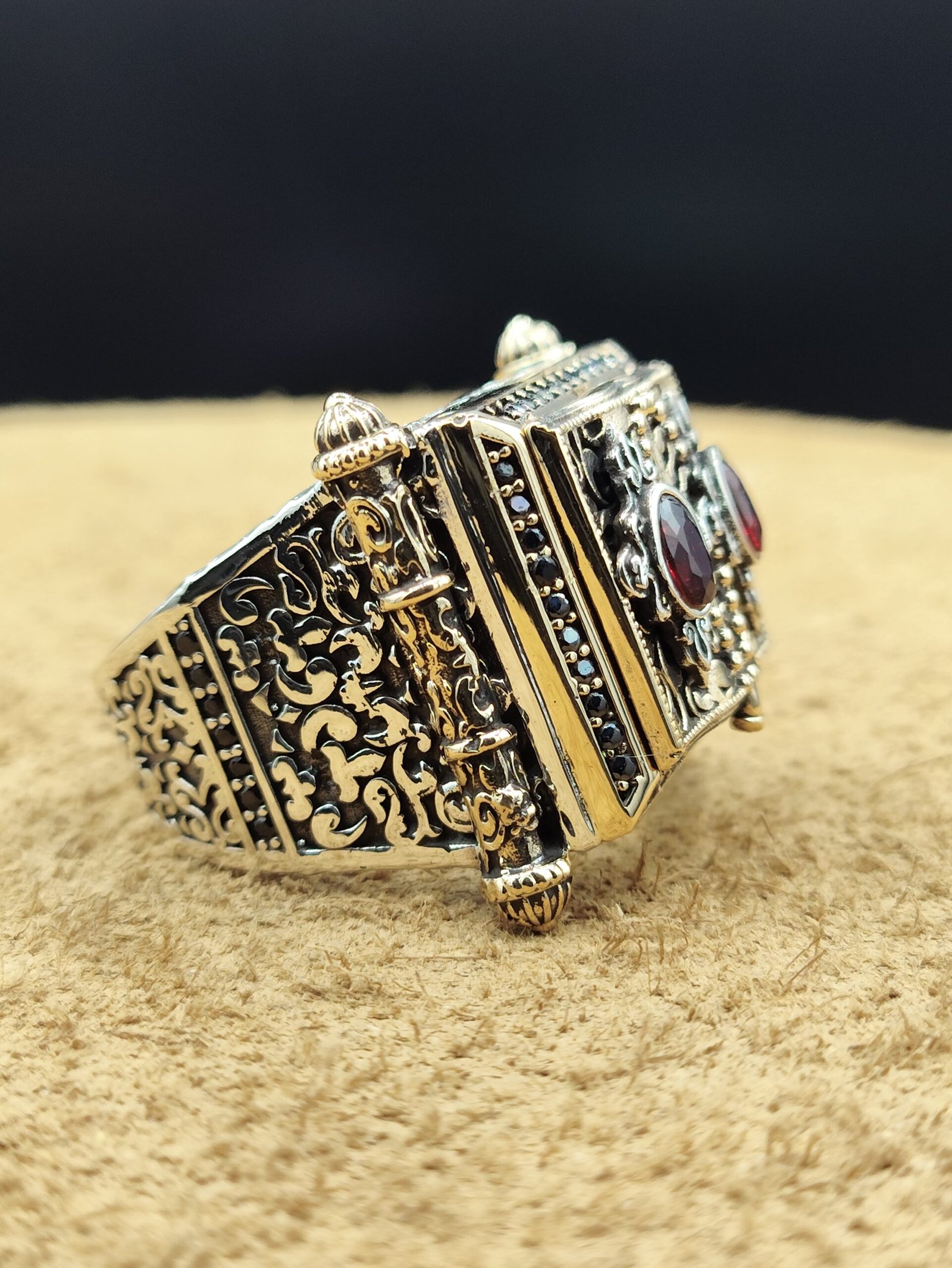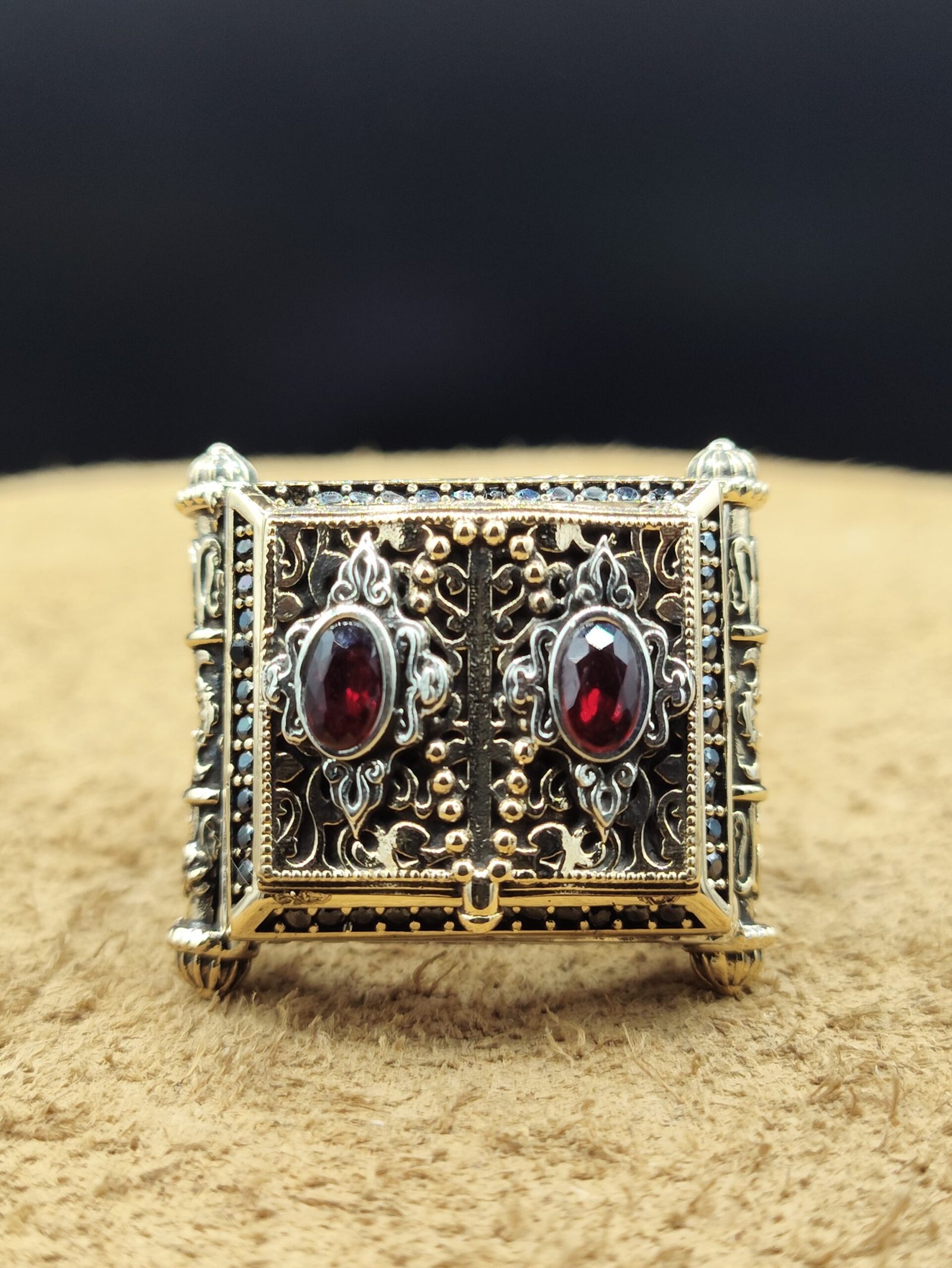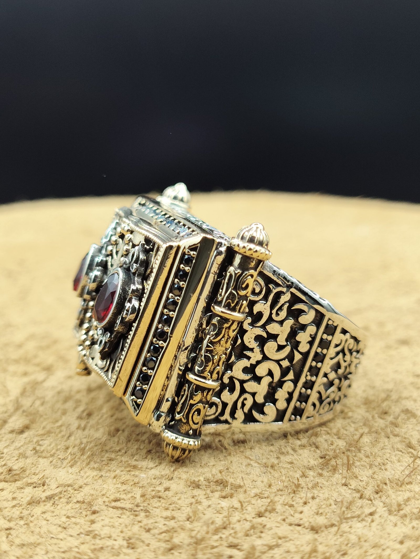 El işçiliği ile üretilmiş benzersiz tasarımı, koleksiyonunuzda özel bir parça olarak yer almasını sağlar. Osmanlı ve Selçuklu motifleriyle süslenmiş bu yüzük, tarihî ve otantik takıları sevenler için harika bir seçimdir.🔹 Malzeme: 925 Ayar Gümüş