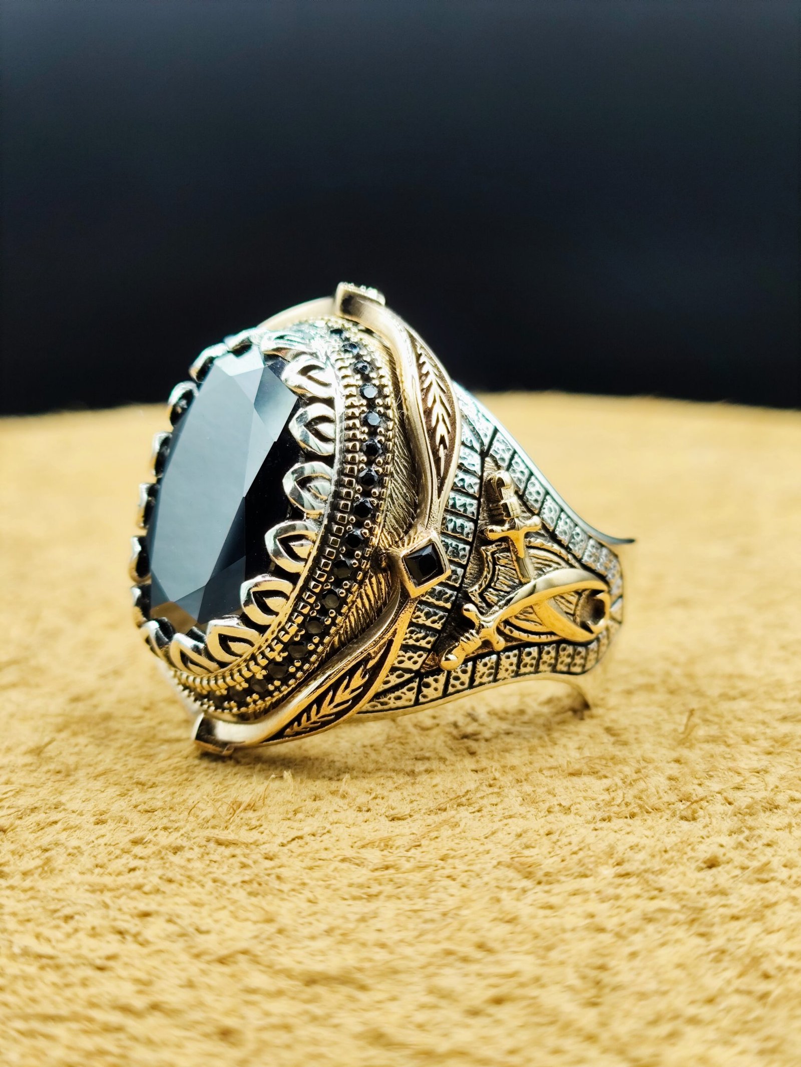 Gücün ve asaleti simgeleyen siyah oniks taşı ile tasarlanan bu özel model, ağır ve karizmatik yüzük seven erkekler için ideal bir tercihtir. 23 gram ağırlığı sayesinde elde dolgun ve güçlü bir duruş sergiler.