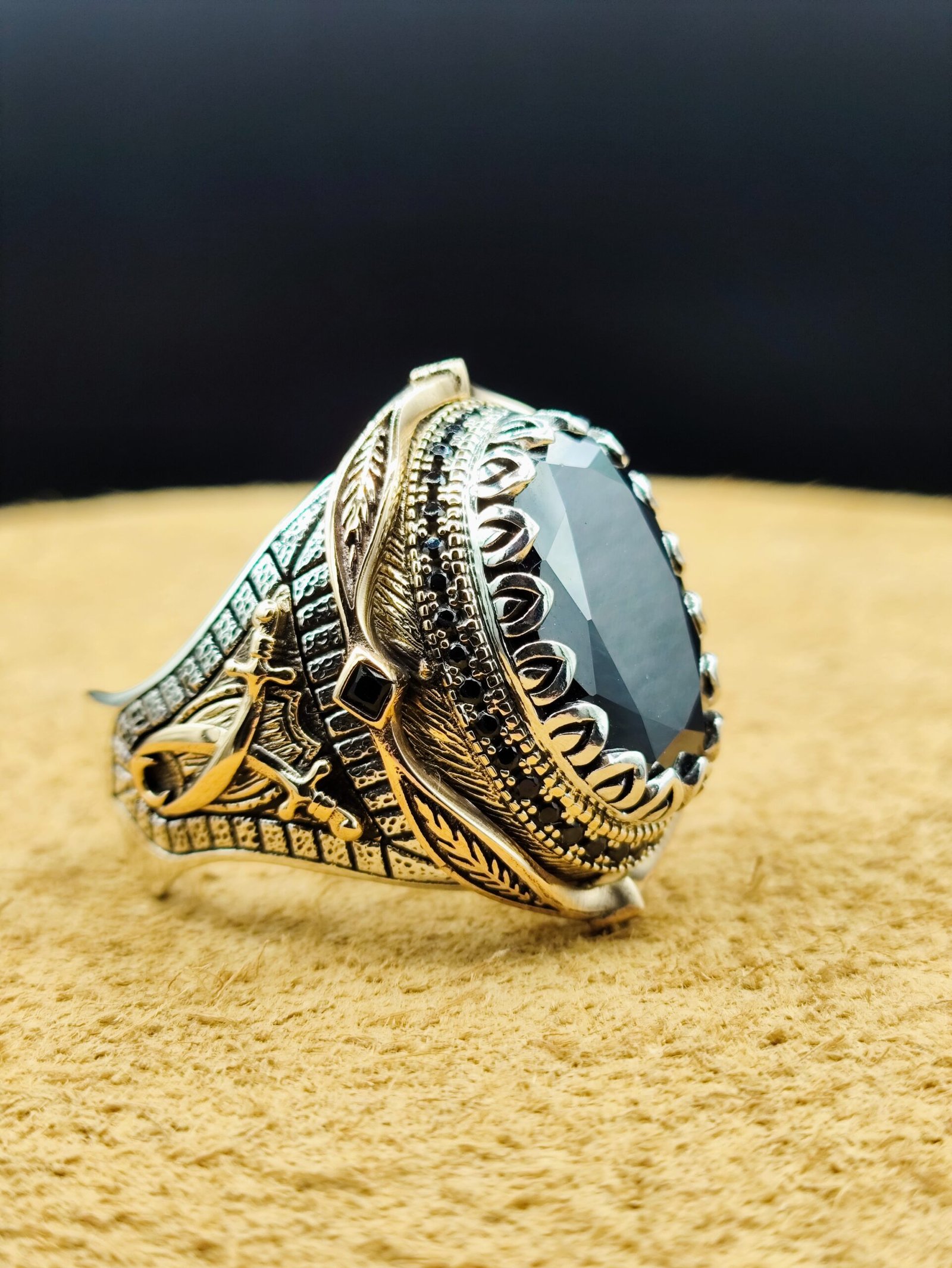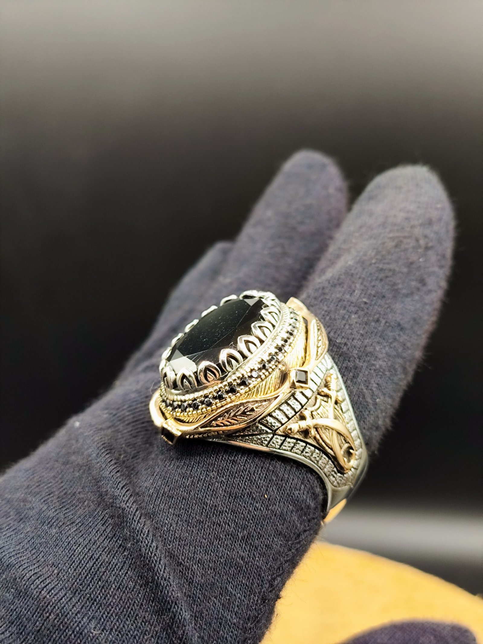 Yüzüğün merkezinde yer alan oval kesim siyah oniks taş, parlak ve derin siyah tonu ile dikkat çeker. Işığı yumuşak şekilde yansıtan yüzeyi, modele sofistike bir hava kazandırır.