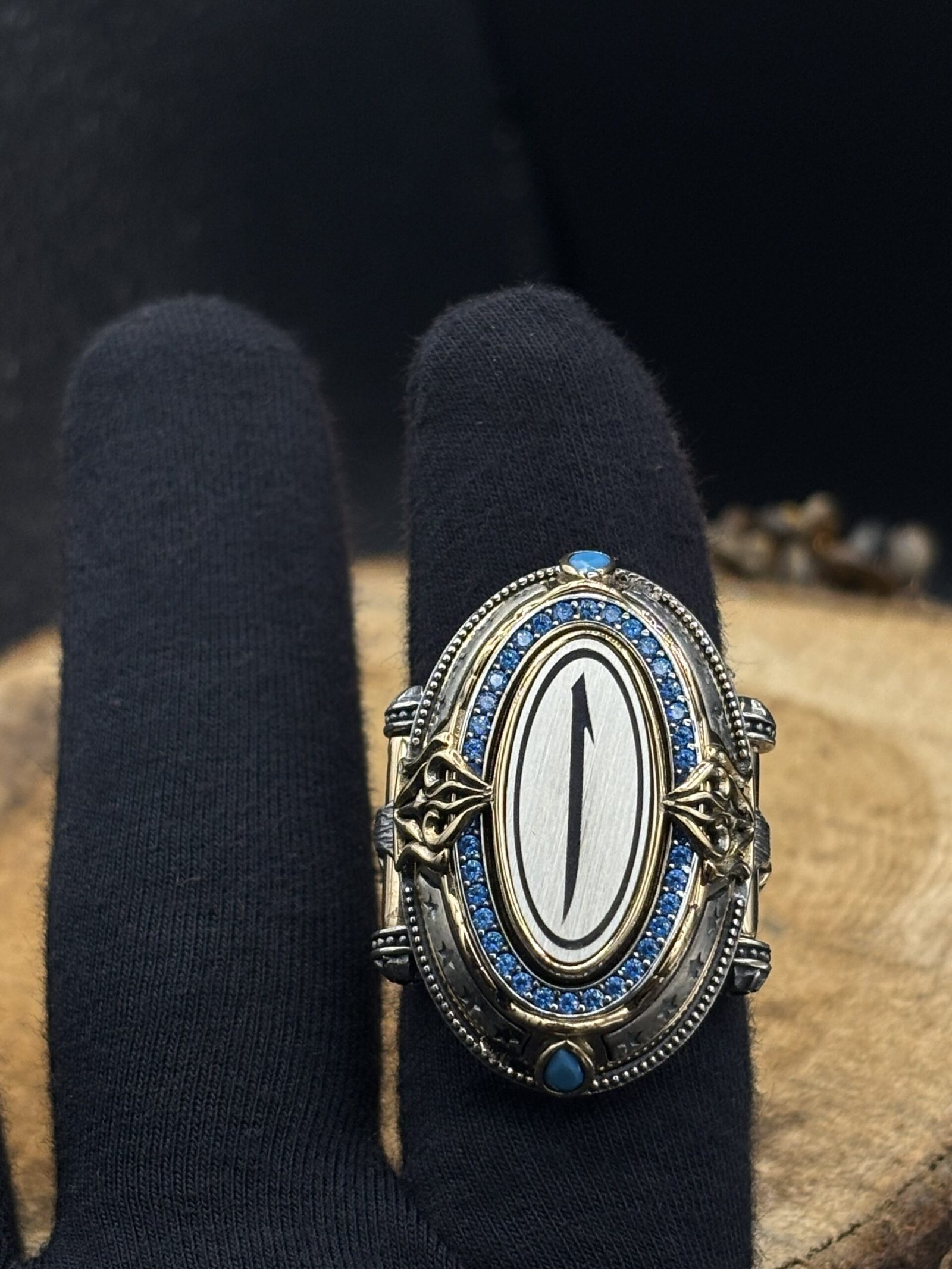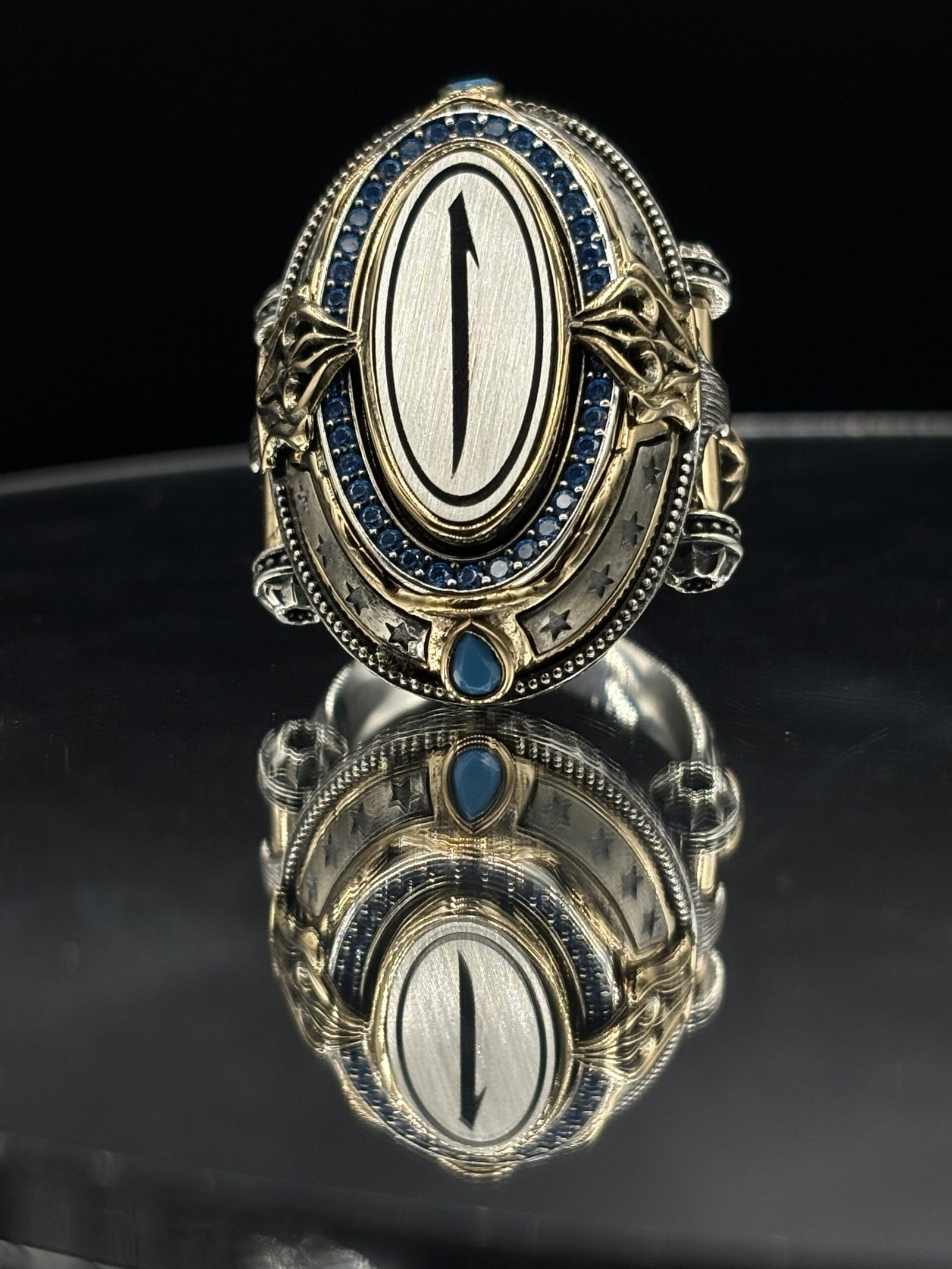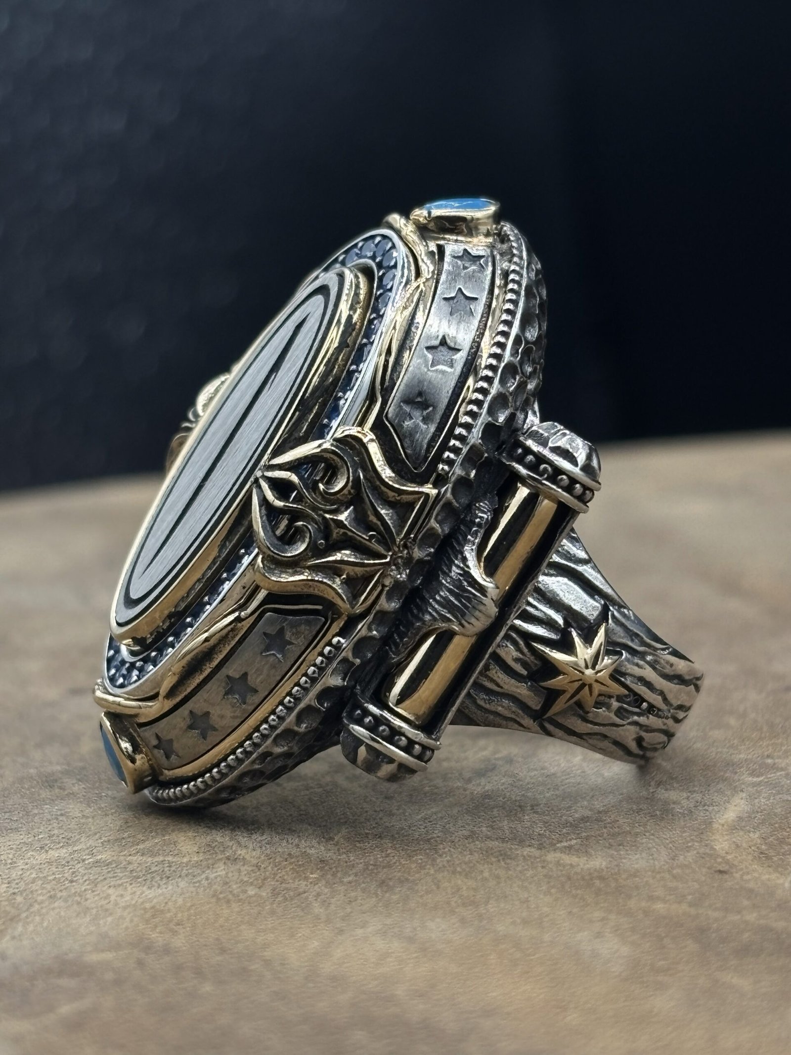 Tamamı 925 ayar gümüşten üretilen bu özel tasarım erkek yüzük, usta zanaatkârlar tarafından el işçiliğiyle titizlikle hazırlanmıştır. Yaklaşık 30 gram ağırlığı sayesinde ağır, tok ve kaliteli bir kullanım sunar. Gösterişli ama anlamlı yüzük arayanlar için ideal bir tercihtir.