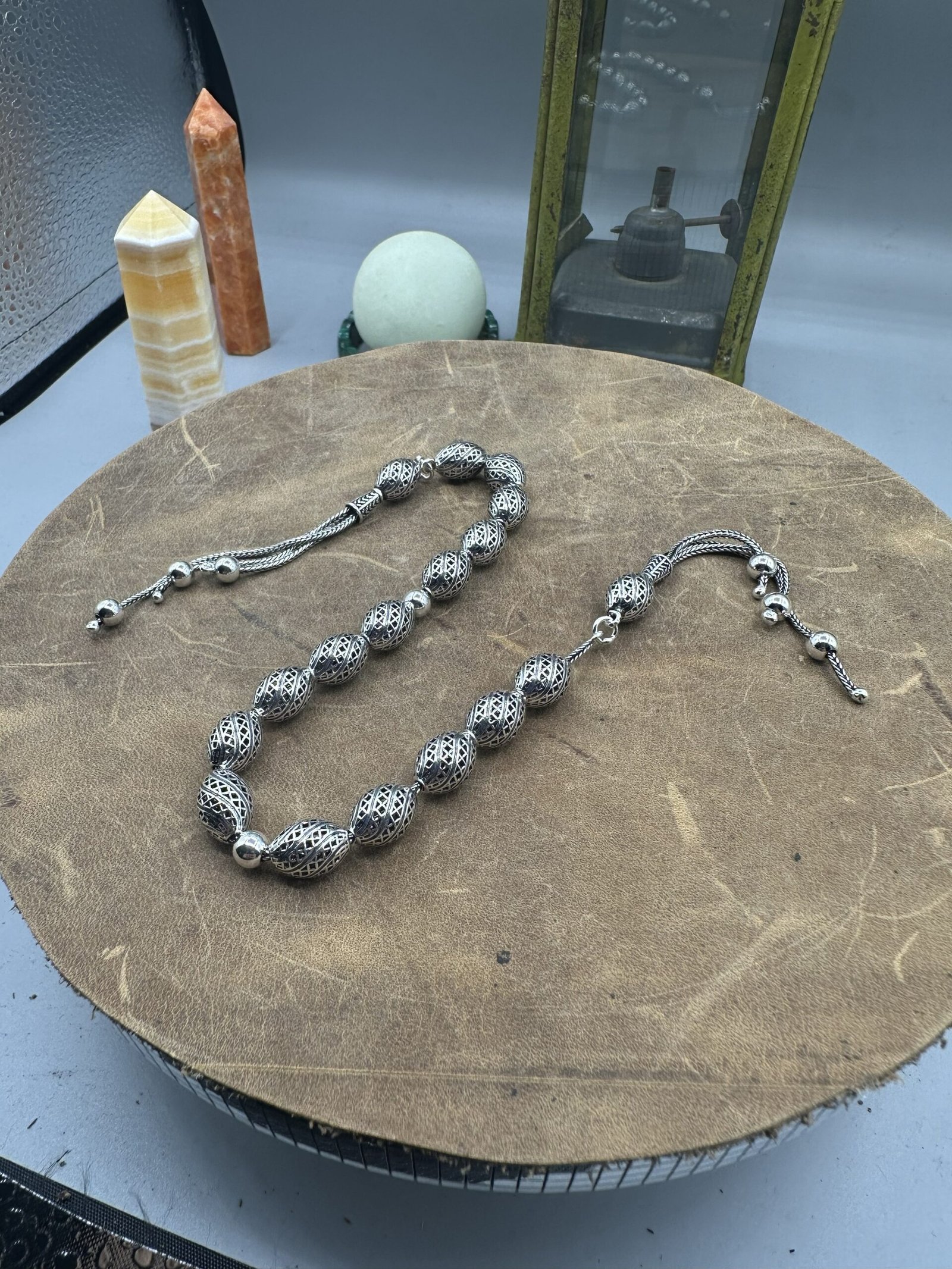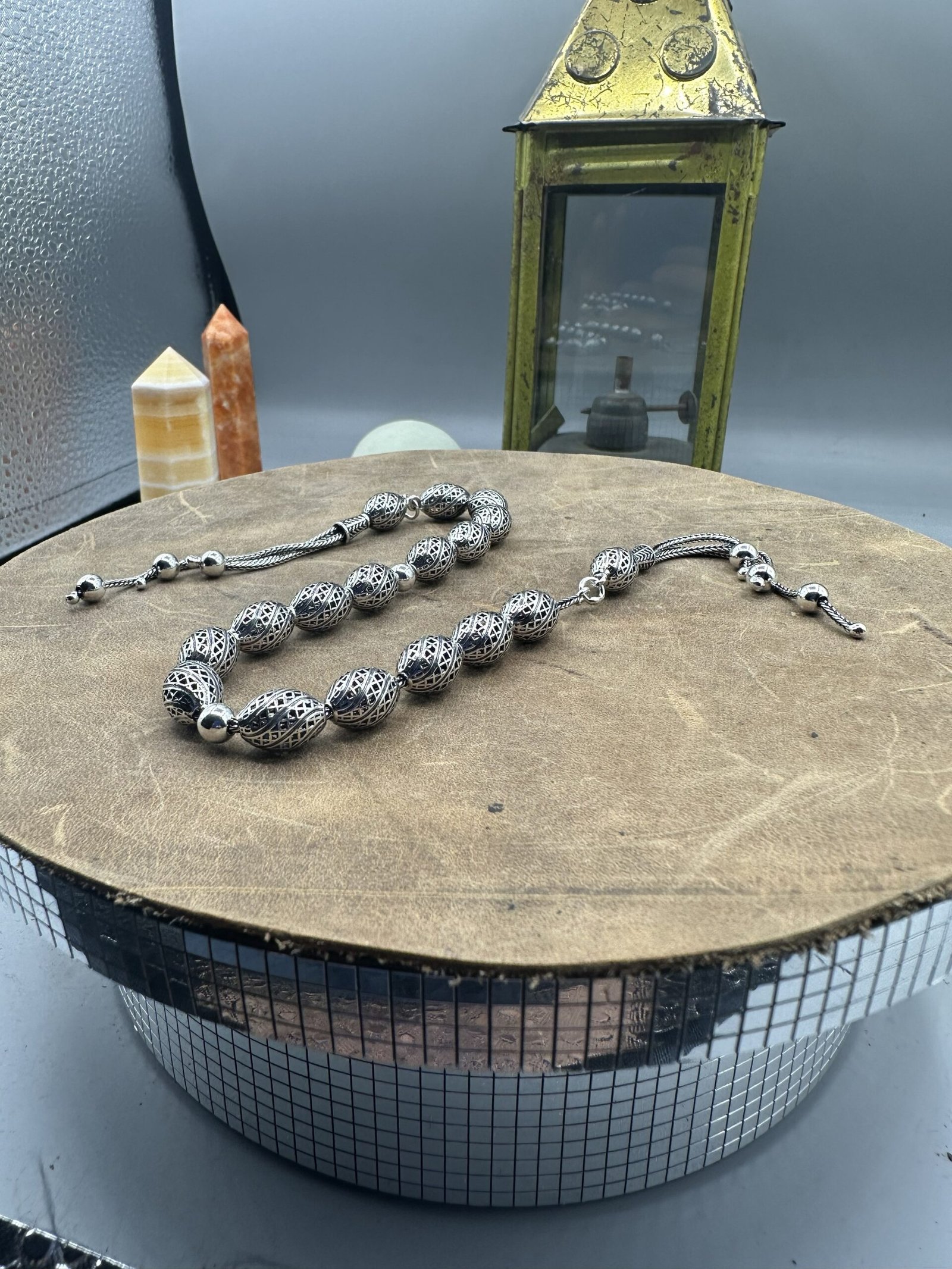 ✨ El işçiliği ile özenle tasarlanmış olan bu tesbih, her bir detayında kalite ve dikkat gösterir. Her bir boncuk, oksitli gümüşün zarif parlaklığını yansıtarak kullanıcısına göz alıcı bir deneyim sunar.