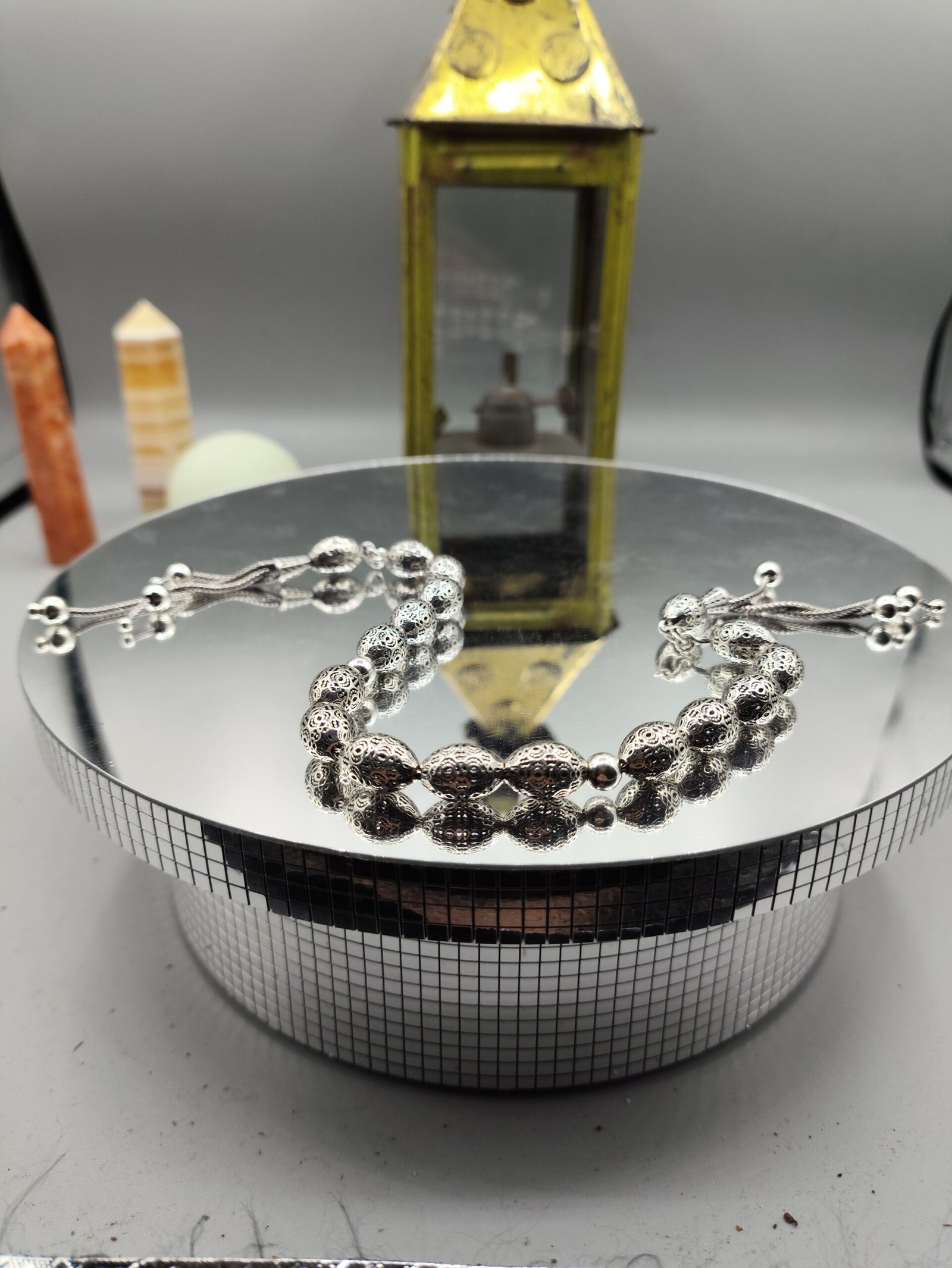 ✨ Bu özel tasarım fizyon tesbih, yüksek kaliteli gümüşten üretilmiştir ve zarafetiyle dikkat çeker. Her bir boncuğu, ustaların elinde özenle işlenmiş olup estetik bir görünüm sunar.