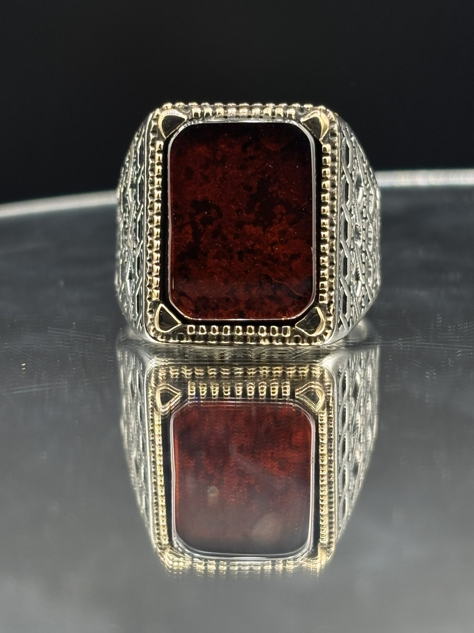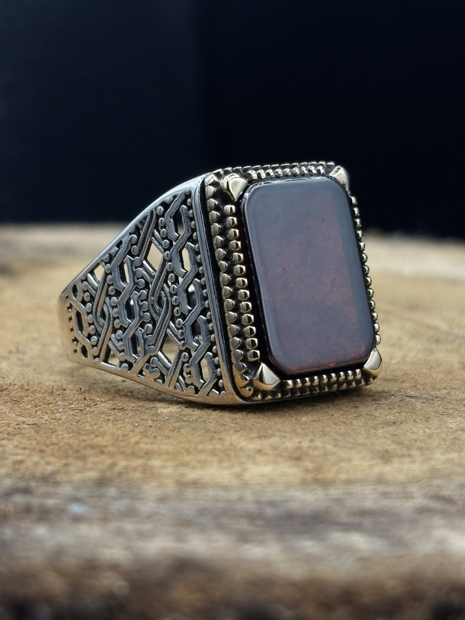 El işçiliği kırmızı akik taşlı erkek gümüş yüzük, hem klasik hem de modern tarzı sevenler için ideal bir tercihtir.