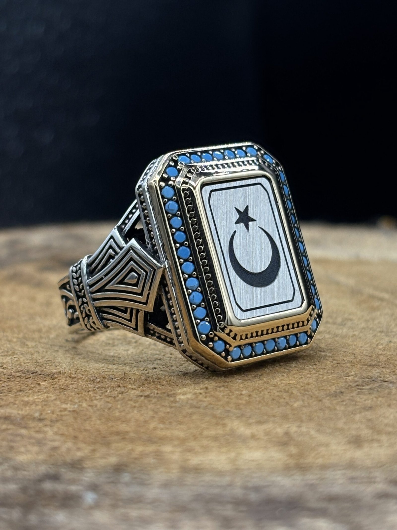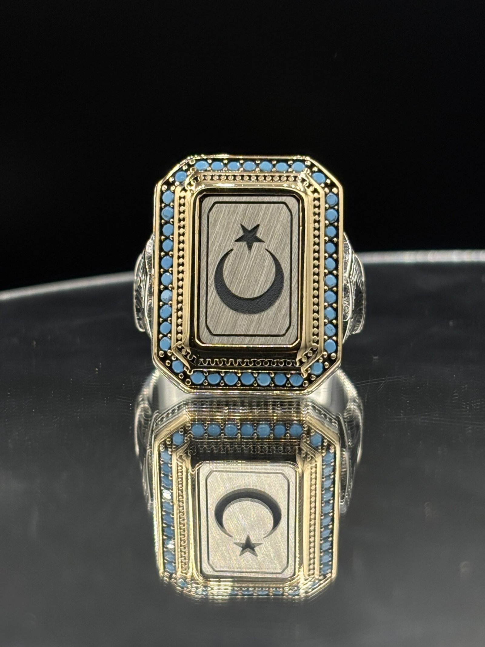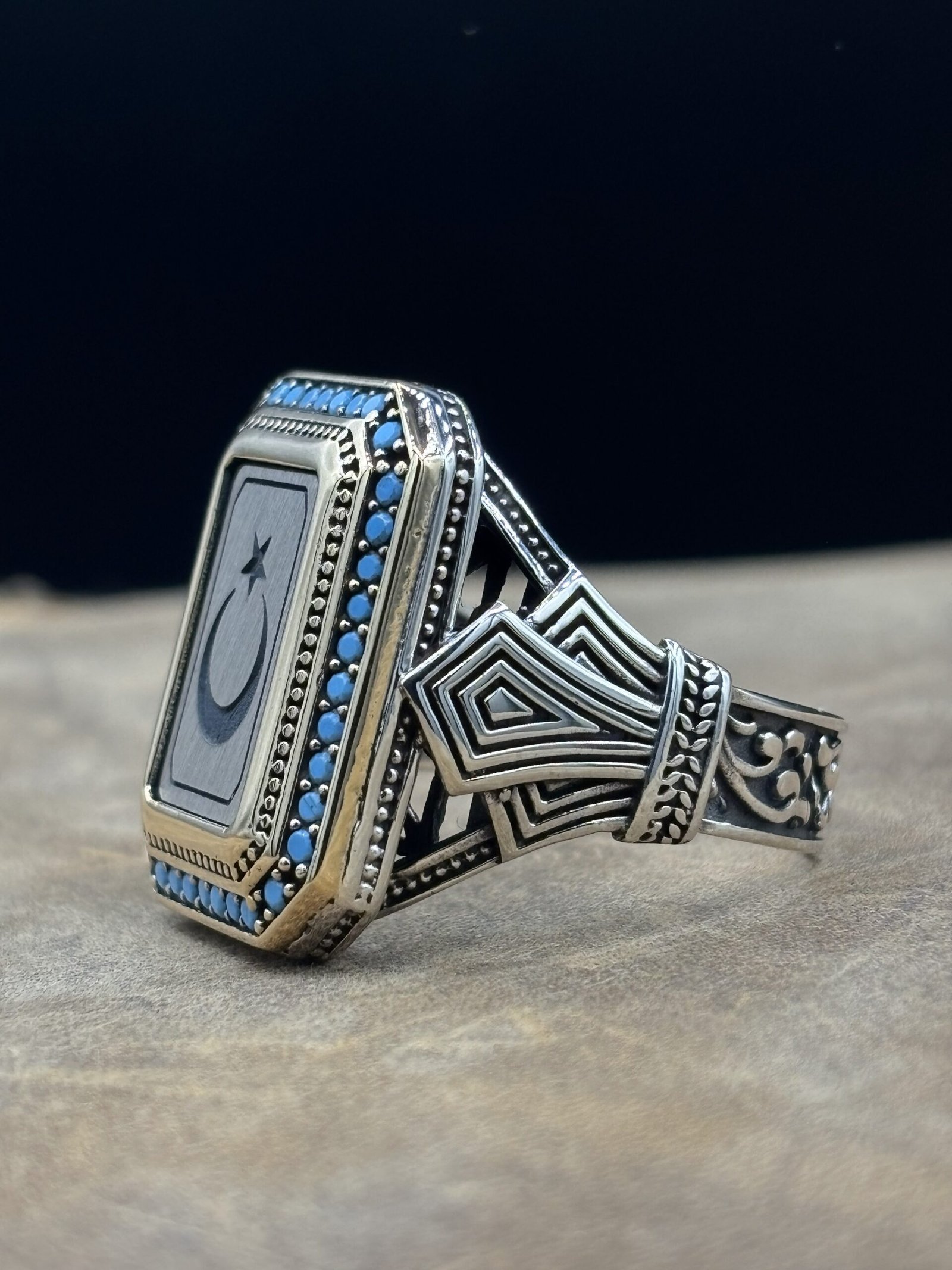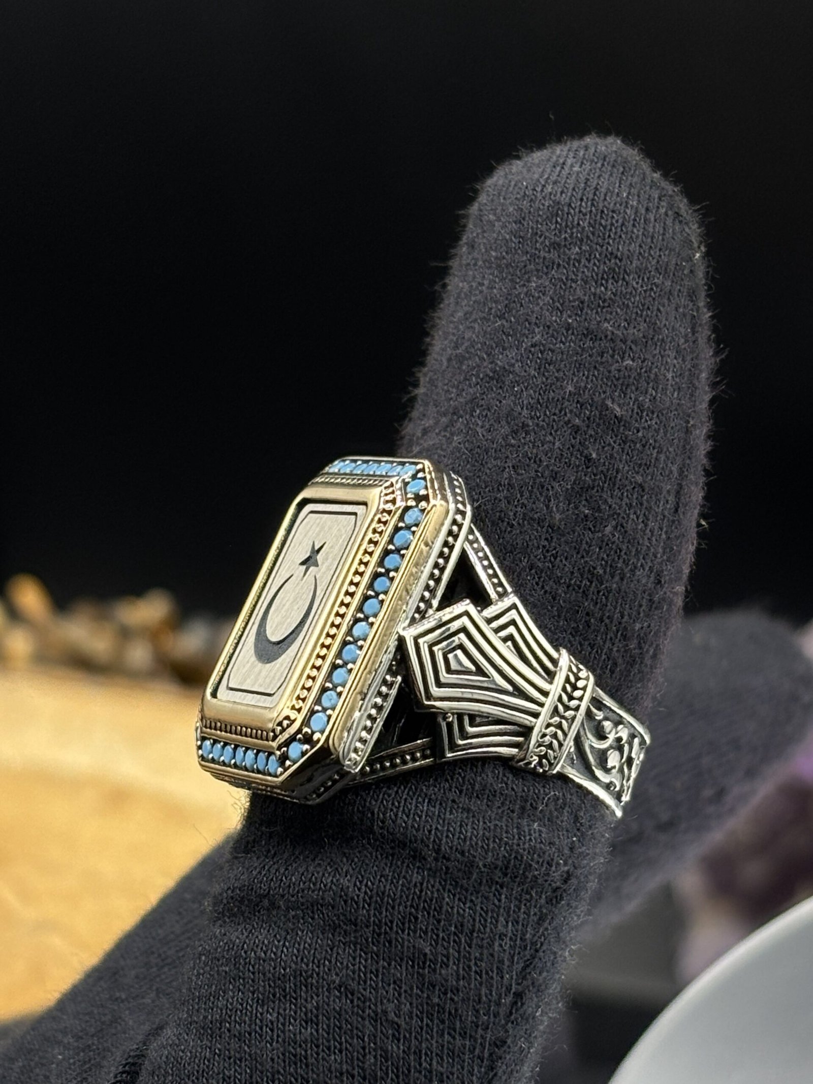 El işçiliği Türk bayrağı motifli erkek gümüş yüzük, hem şık hem de anlam yüklü bir aksesuar olarak dikkat çeker.