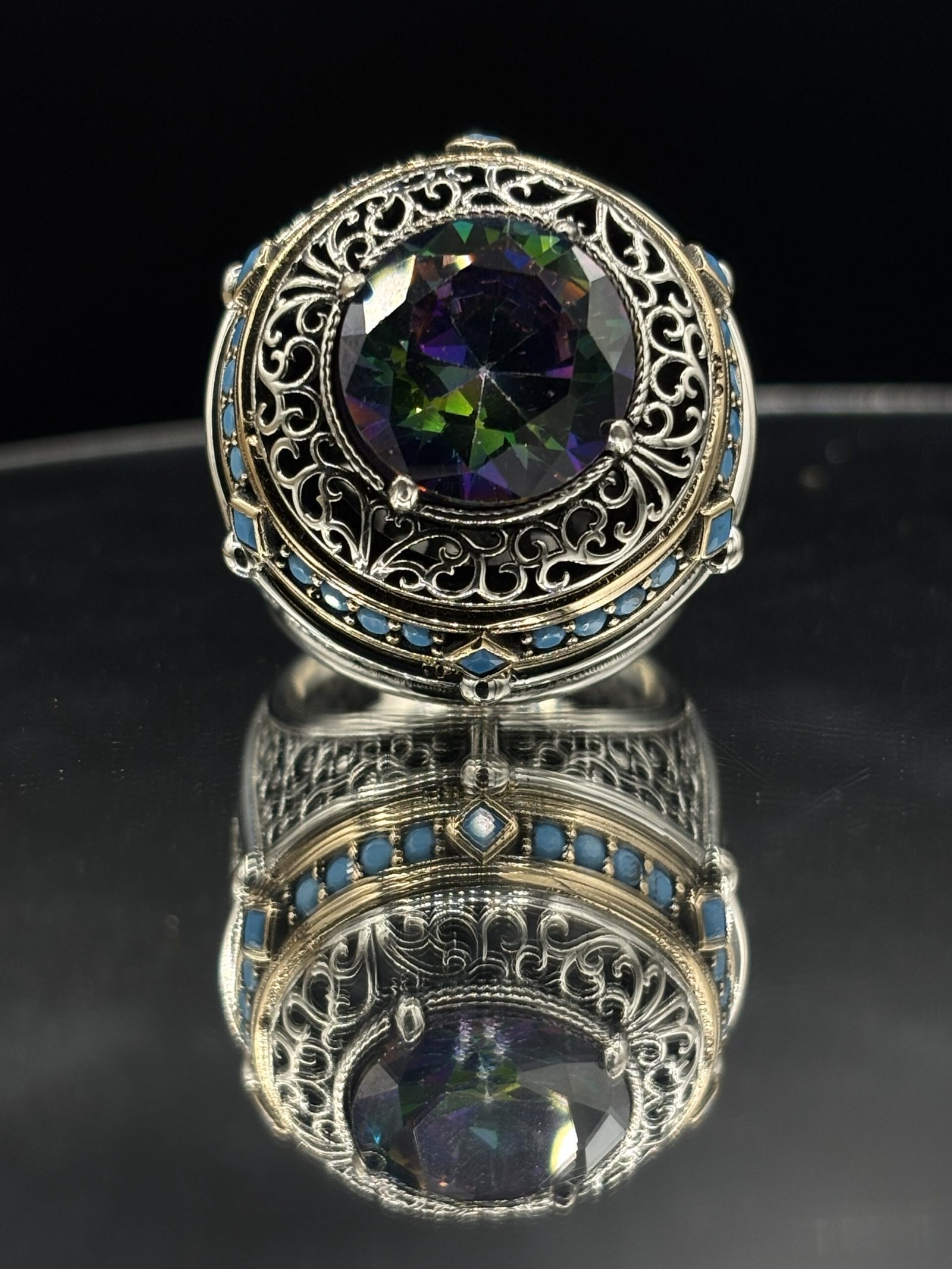 Mistik topaz taşlı 925 ayar gümüş erkek yüzük, ışığa göre renk değiştiren etkileyici yapısı ve özel tasarımıyla fark yaratır. Mistik topaz taşın çok tonlu yansımaları, yüzüğe gizemli ve dikkat çekici bir görünüm kazandırır.