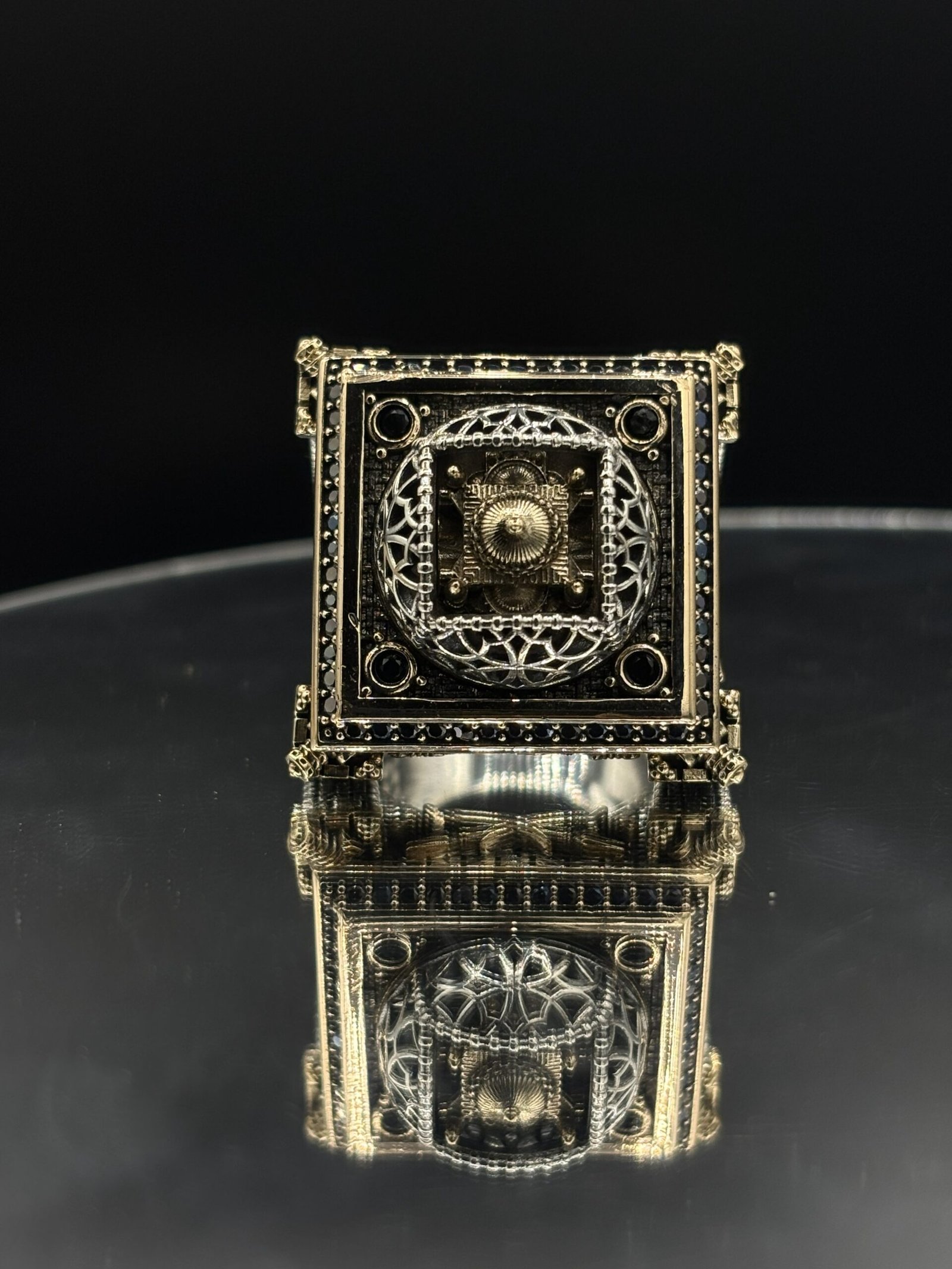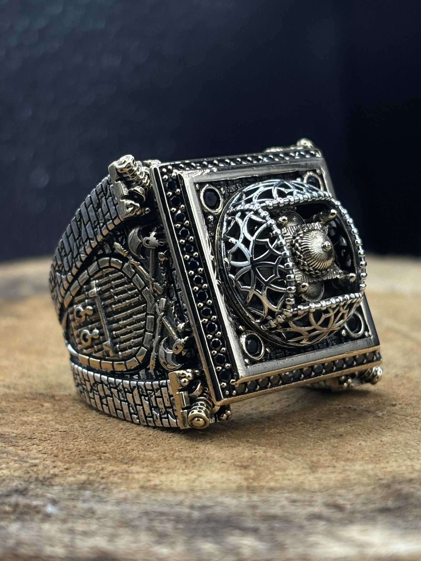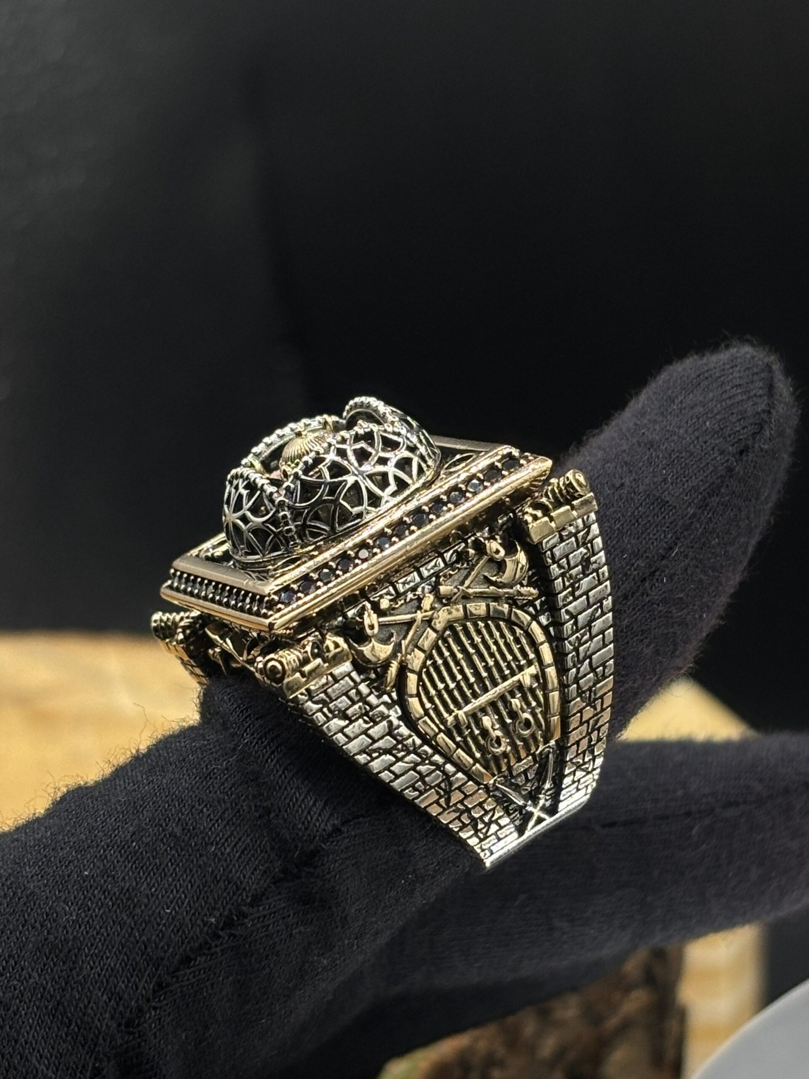 Mescid-i Aksa temalı 925 ayar gümüş erkek yüzük, derin manevi anlamı ve etkileyici tasarımıyla öne çıkan özel bir aksesuardır. İslam dünyası için büyük öneme sahip Mescid-i Aksa motifi, yüzüğe asalet, güç ve anlam kazandırır.